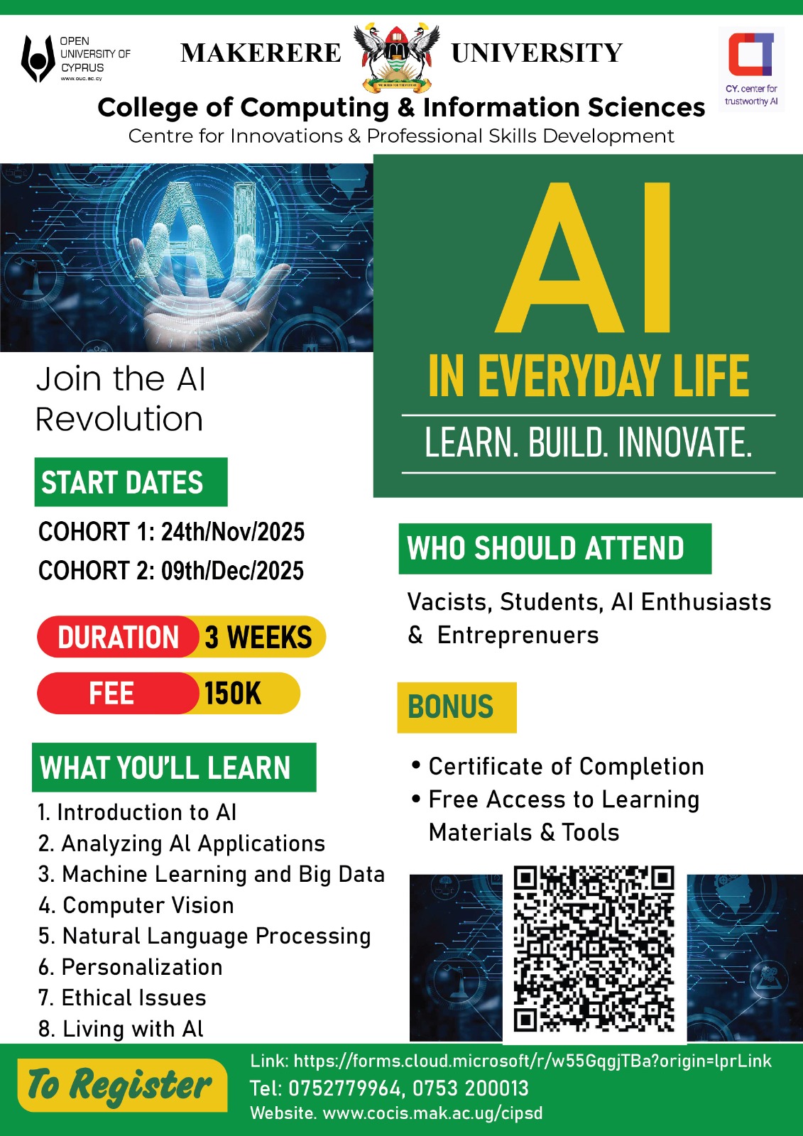 Makerere University Centre for Innovation & Professional Skills Development in partnership with the Open University of Cyprus invite applications for AI in Everyday Life Skills Training 2025